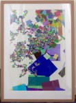 The work experiments with effects of variations in colour and opacity. Overlapping geometries greatly heighten the illusion of depth in the work.